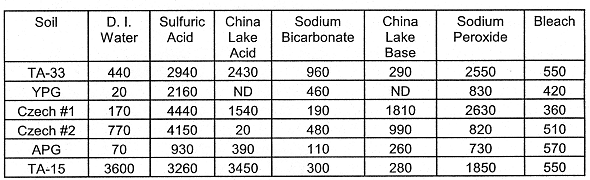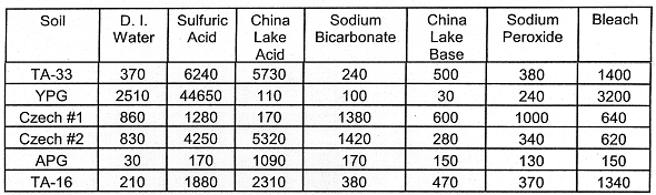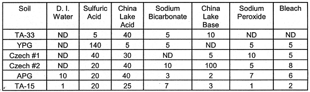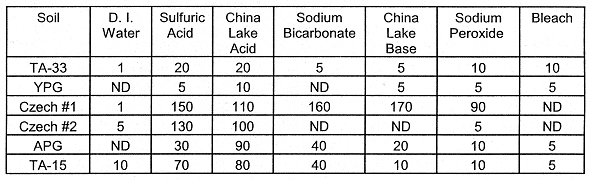 TA-33 Firing Soil: The Bleach solution (followed by the Sodium Bicarbonate solution) removed 70% of the total soil U. The Sulfuric Acid, China Lake Acid, Sodium Bicarbonate and China Lake Base solutions (listed Table II) leached nearly the same cumulative quantity of U from the TA-33 soil (Tables III and IV). Additionally, most of the U was leached within the first 48 hour equilibration by the four solutions. The U in the TA-33 Soil (Tables III and IV) was efficiently leached with Sodium Bicarbonate after the soil was equilibrated with the oxidants (Sodium Peroxide and Bleach solutions). Because of the greater quantity of U leached after the oxidation, it is likely this soil contains reduced U species (such as uraninite, UO2(s)).