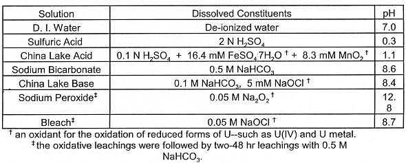 Six of the seven leaching solutions were selected because they have been used to remove U from soil and from contaminated surfaces. The Sulfuric Acid solution was used by Oak Ridge National Laboratory (USID, 1992) for preliminary laboratory studies on Fernald, OH soils. Uranium contaminated soil from China Lake Naval Weapons Center was leached on site with the solutions labeled China Lake Acid and China Lake Base (Wenstrand and Greene, 1993). The China Lake Acid contains reduced Mn2+ and oxidized Fe3+ which react to form Mn4+ and zero valent iron (Fe0), which has been shown to be a good oxidizing agent for reduced U species (Wenstrand and Greene, 1993). LANL has used the Sodium Bicarbonate, Sodium Peroxide and Bleach solutions for Firing Site soil and the surface decontamination of explosion debris (unpublished research at LANL by Nan Sauer and Brandy Duran, 1996). The Sodium Peroxide and Bleach solutions are oxidizing agents which can convert reduced forms of U to more soluble oxidized forms such as U(VI).