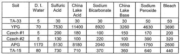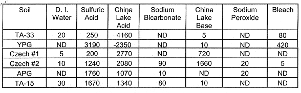 Iron (Fe): Iron, like Mn is also a common soil constituent. Its solubility is greatest at low and high pH (pH<3 and pH>10). Increases in soluble Fe may be indicative of soil weathering. In soil, Fe often exists as oxides, phosphates, silicates and to some degree, carbonates. As with Mn (above), the acidic solutions leached more Fe from the soils than the basic solutions. Two leaching agents, the Sodium Peroxide and China Lake Base solutions leached appreciable quantities of Fe from two soils (the YPG and the CZ. #2) such as the (Table VI). However, both acidic solutions appeared to have the greatest effect of leaching soil Fe.