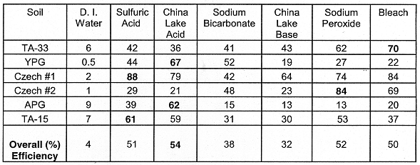 LANL TA-15 Soil: As with the APG sand, the two acidic solutions were most effective at removing U from the soil (Tables III and IV). The Sodium Peroxide/Bicarbonate leaching was nearly as efficient at removing U from the TA-15 soil as the acidic solutions (53% for the sodium bicarbonate versus 59 and 61% for the two acid solutions).