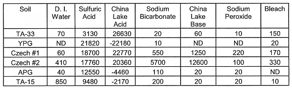 Silicon (Si): Silicon is soluble in high and low pH solutions (pH<2 and pH>10). Silica may exist as an oxide such as quartz (SiO2) or with complex soil silicates such as vermiculite (Mg0.3(Mg,Fe3+,Al)3(Si3Al)O10(OH)2). Generally, Si was quite soluble in the acidic leaching solutions (Sulfuric Acid and China Lake Acid) and the Sodium Peroxide and China Lake Base solutions as compared to the Sodium Bicarbonate and the D. I. Water (Table VII). Silica was most soluble in the Sulfuric Acid leaching solution.