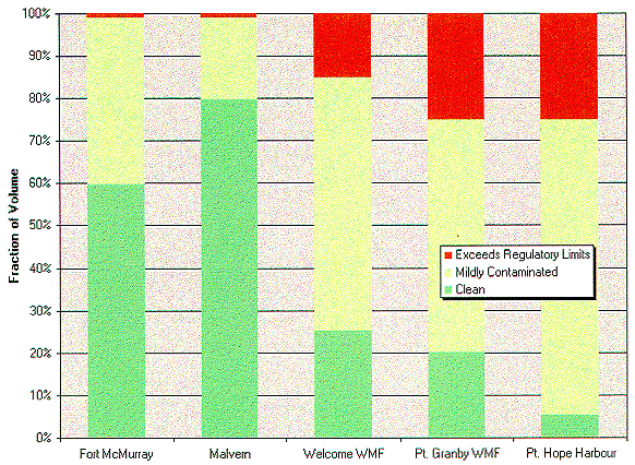 Using the criteria selected for this study, material from each of the five sites was divided into one of the three categories. In the case of Fort McMurray and Malvern, where the work has already been carried out, excavation volumes were used. Note that clean up in Fort McMurray is not yet complete, and in this case only material which has already been excavated is considered here. For the Welcome and Port Granby WMFs, the volume considered is that from the surface to the lowest depth of material which is not clean. This approximates the volume of material which would have to be excavated to remove all material which is mildly contaminated or which exceeds regulatory limits. For the Port Hope Harbour, the total volume of sediments is considered.