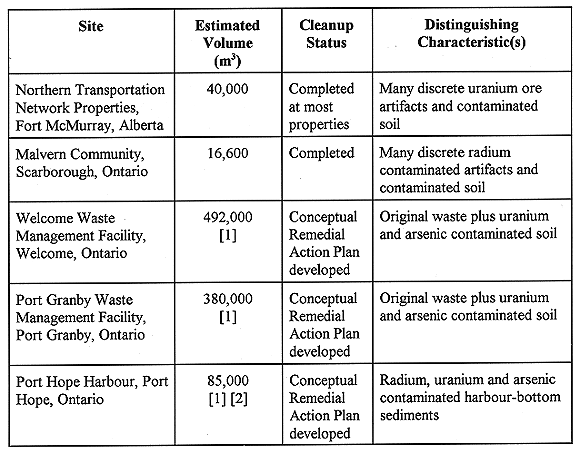 With respect to inventory and volume determinations, the selected sites fall into two categories: those where cleanups have already occurred, and those where cleanup is yet to be done. Cleanup has already taken place at the Fort McMurray and Malvern sites, and is planned at the Welcome and Port Granby sites, and at the Port Hope Harbour.