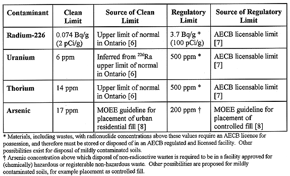 For the purposes of this study, three categories of material have been defined based on contaminant concentration or specific activity. "Clean" material is that material which has no usage restrictions, or for which concentrations or specific activities of all potential contaminants do not lie above the natural background range. Material which exceeds selected regulatory limits or guidelines for any given contaminant is said to "Exceed Regulatory Limits". Material which cannot be categorized as Clean, but which does not exceed the selected limits is classified as "Mildly Contaminated".