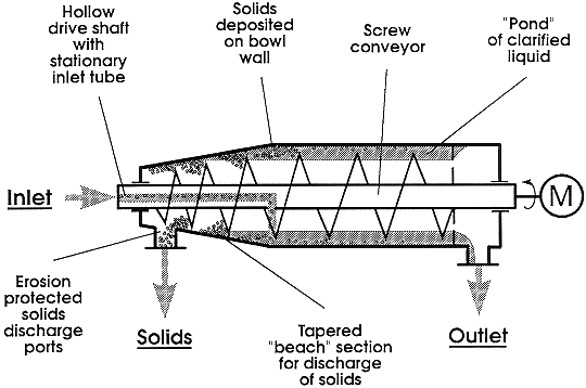 Separation takes place in a horizontally arranged conical/cylindrical rotor consisting of a bowl and a screw conveyor that continuously scrolls out the solids. The conveyor rotates in the same direction as the bowl does, but at a slightly lower speed.