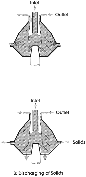 In the separator, the smaller-sized solids which remained in the clarified liquid are separated through centrifugal force. They are discontinuously discharged as a slurry to a slurry tank situated below.