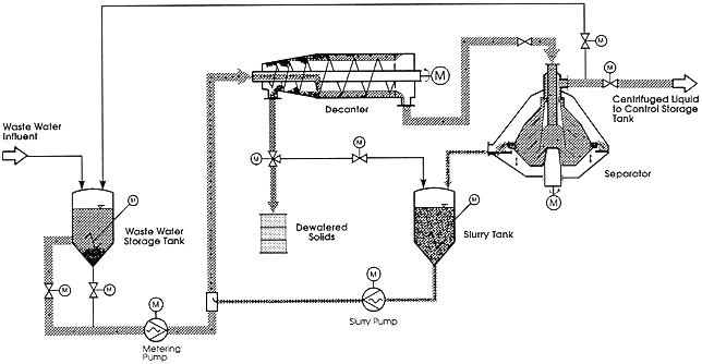 The throughput capacity of the waste water influent depends on the dewatering characteristic of the solids which are separated with the decanter. The main criterion is to get a dewatered product over the whole campaign of each liquid waste stream. After stipulating the specific throughput of each waste water stream a dewatered product will be produced continuously. The specific throughput capacity of each liquid waste stream is a characteristic value of the hold-up time of the solids separated with the decanter, depending on their different dewatering characteristics. The hold-up time will be adjusted over the differential speed between conveyor and bowl of the decanter.