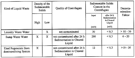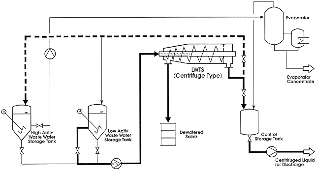 If the activity content in the centrifuged liquid is higher than the limit value, it will be fed back into the waste water storage tank. When the centrifuged liquid includes decantable solids, it will be treated again with the LWTS. When the centrifuged liquid does not include decantable solids, it will be fed to the evaporator after lateral extraction out of the waste water storage tank above the cone area.