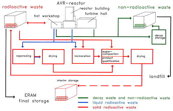The solid and liquid waste will be treated at the Research Centre Jülich where the necessary facilities are available, e.g. evaporator, incinerator, high-pressure press and interim storage facility.