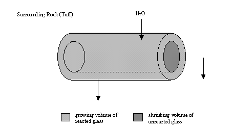 As water infiltrates the emplacement it reacts with glass, producing an annular region of alteration layers (to be described below). This layer moves into the glass as the reaction proceeds. The depletion of soluble poisons in this region may lead to a criticality event. Figure 1 is a graphical representation of the system as it evolves.