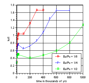 Figure 4 shows the effect of control element removal for a glass log loaded with 8 wt% PuO2. Even at the assumed maximum Pu loading, only a relatively small concentration of Eu is needed to hold down reactivity. Both the thermal neutron cross section and resonance integral of Eu-151 are an order of magnitude higher than those of Pu-239. A mole ratio of 1/2 Eu to Pu kept the system subcritical for more than 800 thousand years. Due to the atomic mass differences between Pu and Eu, this corresponded to a loading of less than 3 wt% Eu2O3 (2.6 wt% Eu).
